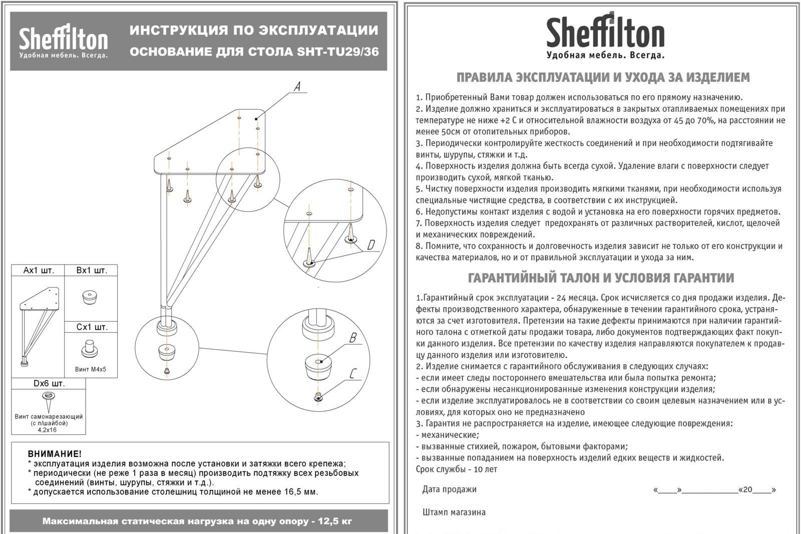 Максимальная нагрузка на одну опору 12,5 кг.